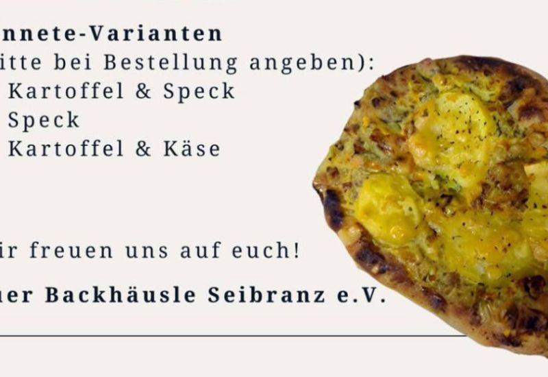 Seibranz – Am Freitag, 11. April, von 17.30 Uhr bis 19.30 Uhr bieten wir, das Backhaus-Team, wieder unsere leckeren, ofenfrischen Dinnete für 5 EUR pro Stück am Backhaus in Seibranz zum Verkauf an. Bei schönem Wetter gibt es auch Getränke und Sitzgelegenheiten, die zu einem gemütlichen Plausch einladen.