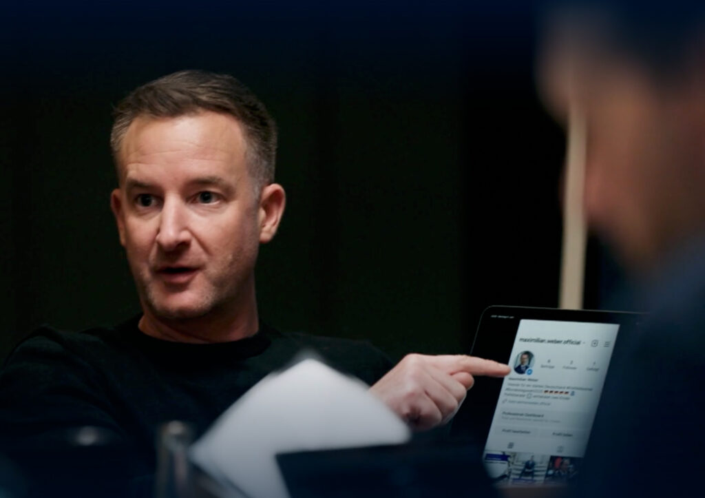 Da darf doch gefragt werden, wie es Florian Vögtle aus dem Schatten des Aulendorfer Schlosses ins Rampenlicht nach Hamburg schaffte? Kein Problem in Zeiten des WorldWideWeb. Der Recherche folgte der Anruf der Produktionsfirma bei der BFG Media Group® in Oberschwaben, und Florian Vögtle ließ sich das Experiment nicht entgehen. „Die Produktion des Films fand im Zeitraum von Mai bis Juli statt, verteilt über insgesamt neun Produktionstage, die sich über etwa zweieinhalb Monate erstreckten. Der Dreh fand in Hamburg in einem James-Bond-artigen Cyberraum statt“, berichtet der 45-Jährige. In dieser Zeit arbeitete das gemischte Team, das sich aus einer Politikwissenschaftlerin über eine Markenstrategin bis zu einem ehemaligen Hacker zusammensetzte, daran, „den Autokraten Maximilian Weber auf KI-Basis zu konzipieren, zu visualisieren und mit der richtigen digitalen Strategie aktiv über die Social-Media-Kanäle an die Bürgerinnen auszuliefern“, erklärt Vögtle.