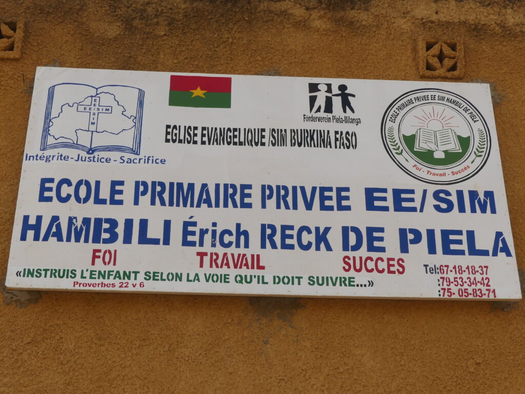 „École primaire privée EE/SIM Hambili Erich Reck de Piela“ lautet das Namensschild der Schule: Erich-Reck-Primarschule Piéla der Evangelischen Kirche. „Hambili“ entstammt der lokalen Sprache und bedeutet: „aus der Gnade Gottes“.