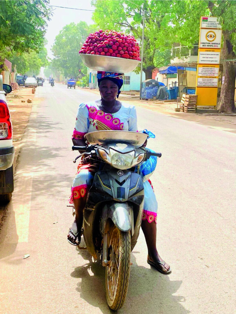Afrikanischer Alltag: Frauen bewältigen den Großteil und wenn nötig mit akrobatischer Anstrengung. Erdbeeren für den Markt.