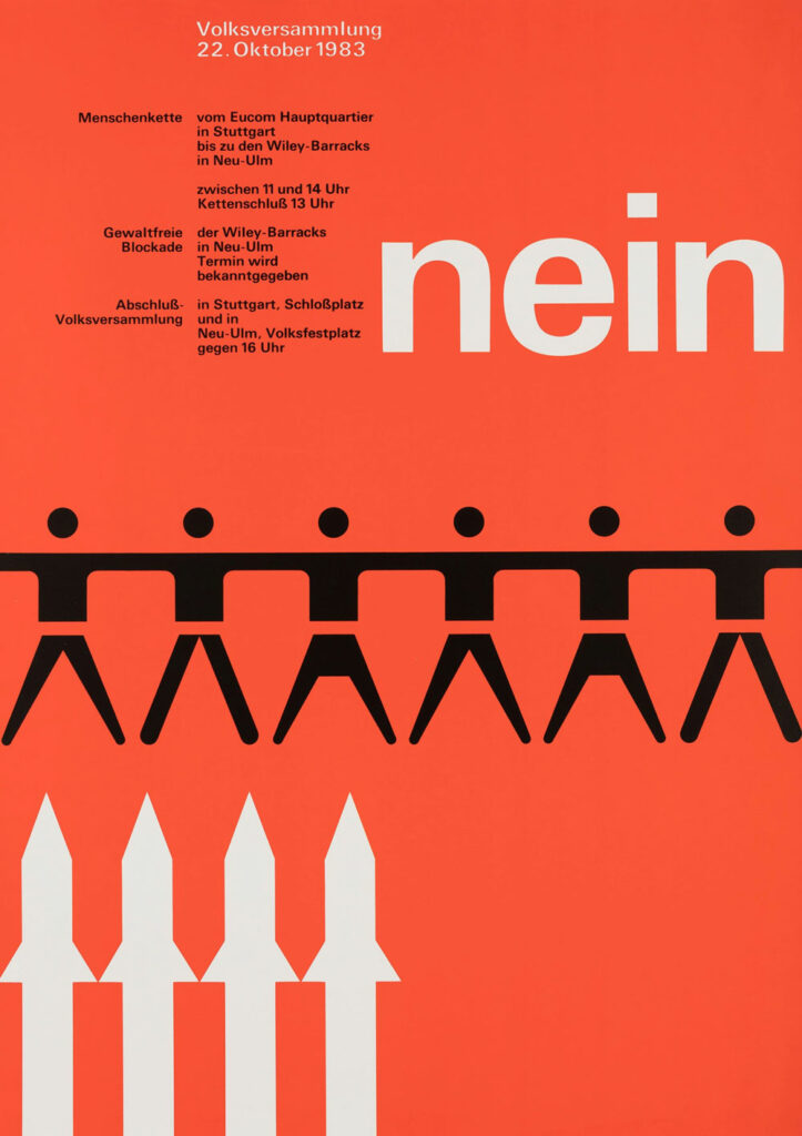 Niemand Geringerer als Otl Aicher, der Grafik-Papst aus Rotis und Mitbegründer der Hochschule für Gestaltung in Ulm, hat die offiziellen Plakate für die Menschenkette entworfen. HfG-Archiv