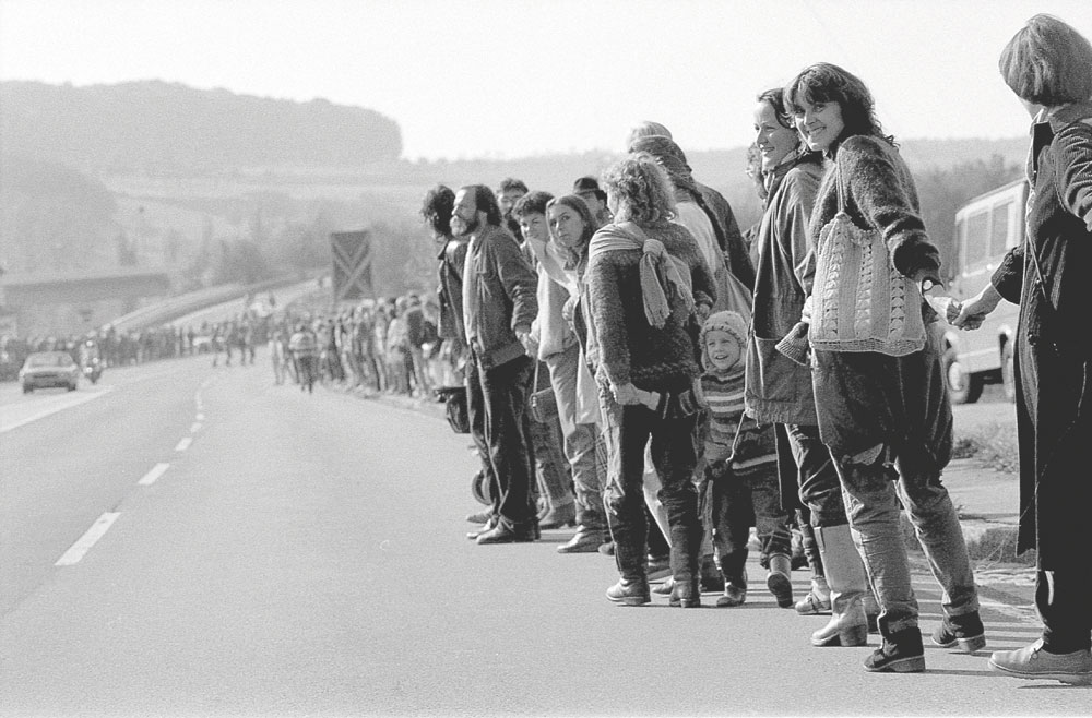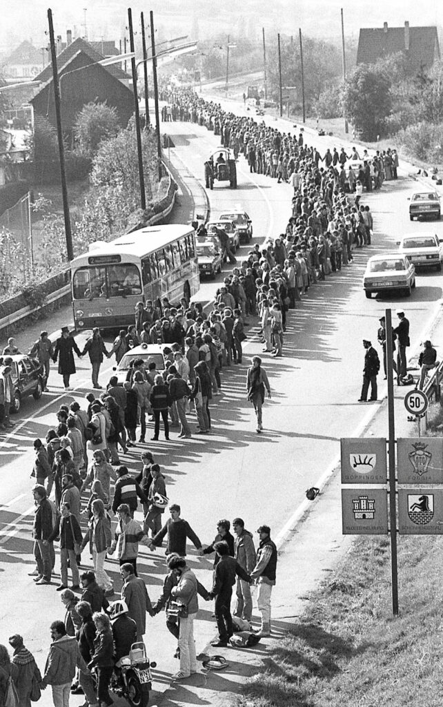 108 Kilometer lang war die Menschenkette, die sich bei schönem Herbstwetter am Samstag, 22. Oktober 1983, von Stuttgart-Vaihingen nach Neu-Ulm auf der B 10 erstreckte. Vielerorts war es nicht nur eine Kette, sondern gleich mehrere. Insgesamt sollen es annähernd 400.000 Menschen gewesen sein, die sich daran beteiligten. Fotos: Leuschner