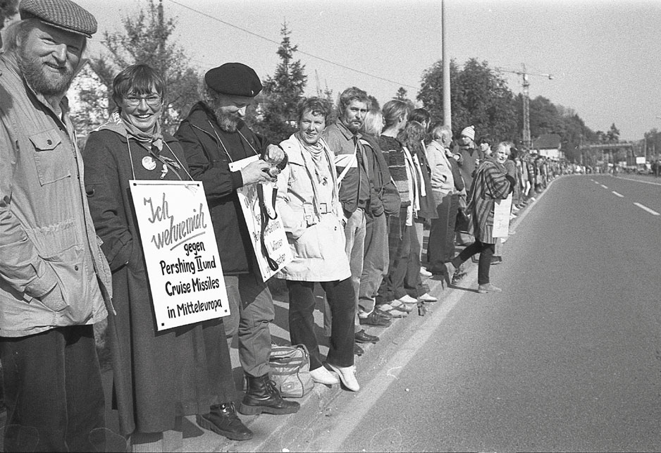 Der 22. Oktober 1983 war ein schöner Herbsttag, ein Samstag mit Fußballwetter. In Stuttgart wartete der VfB ungeduldig auf den FC Bayern München. Das Top-Spiel war verschoben worden, es sollte erst um 17 Uhr beginnen. Der Grund: eine Abschlusskundgebung mit über hunderttausend, vielleicht sogar über zweihunderttausend Menschen, die sich selbst feierten, blockierte die Landeshauptstadt. Denn an diesem Tag war es der Friedensbewegung um 12.40 Uhr gelungen, zwischen Stuttgart und Neu-Ulm, entlang der B 10 eine 108 Kilometer lange Menschenkette zu bilden, um damit gegen den drohenden Beschluss der so genannten „Nachrüstung“ durch den Bundestag zu protestieren. 20 Minuten lang hielten sich bis zu 400.000 Menschen an den Händen, um zu verhindern, dass 108 Pershing-II-Atomraketen in Mutlangen und anderswo stationiert werden. Streckenweise standen die Menschen, jung wie alt, von überall aus dem Ländle kommend, mit Hund und Kindern nicht nur in einer Kette, sondern sich in einer Doppelkette gegenüber und sangen „We shall overcome … we’ll stand hand in hand“ und hüpften zu „Hopp-hopp-hopp, Atomraketen-Stopp“. Ein ewig langer Lindwurm in friedlicher Verzückung.