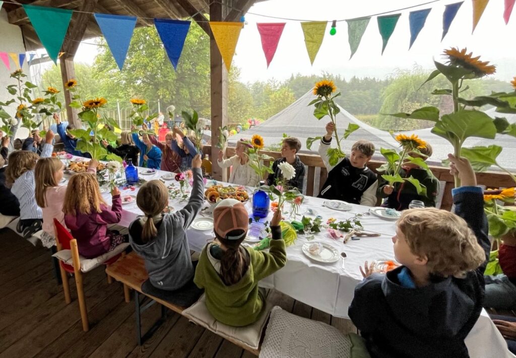 Dann ist Morgenkreis. Mit einem Morgenlied versammeln sich alle – auch die „Großen“ – im Kreis auf der Wiese vor dem Gebäude und das „Kind des Tages“ darf mit einem Ritual den Schulbeginn starten. „Unser Konzept beinhaltet viel fächerübergreifendes, lebenspraktisches Lernen“, sagt Vorstandsmitglied Tamara Schlosser. So haben die Fünftklässer zum Beispiel ein Mal Mittagsschule und kochen ihr Mittagessen mit den Lernbegleitern in der Schule. Auch Exkursionen in die nähere Umgebung gibt es. „Raus in die Natur, von der Natur lernen, Sinneseindrücke sammeln“, das waren die inhaltlichen Vorstellungen des Gründerteams, das sich aus der Elternschaft von Waldkindergarten-Kindern gefunden hatte. Vom ersten Gedanken bis zum Start der Schule war viel Durchhaltevermögen erforderlich und eine tiefe inhaltliche Auseinandersetzung mit den Fragen einer Schulgründung – auch finanzieller Art: Die ersten drei Jahre muss die Schule ohne staatliche Förderung auskommen, erst dann gibt es Zuschüsse vom Land. Allerdings nicht zu 100 Prozent, deshalb müssen die Eltern auch, abhängig vom Einkommen, für ihre Kinder Schulgeld bezahlen.