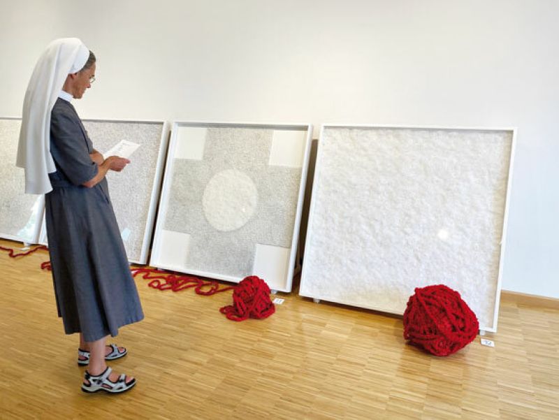 Bad Saulgau – Mystische Gedanken aus Christentum, Buddhismus und Sufismus prägen das Werk der Künstlerin Elisabeth Finck. Bis 2. September sind ihre großformatigen Arbeiten im Torhaus von Kloster Sießen zu sehen.