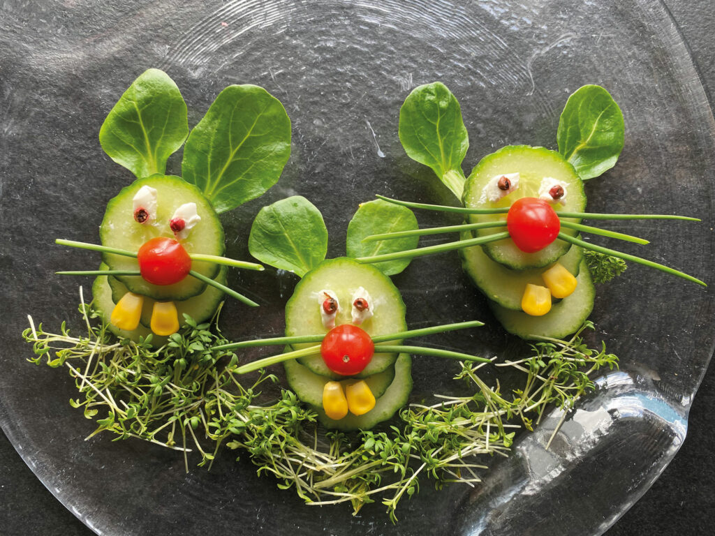 Die Häschen lassen sich aus einer Gurkenscheibe aufbauen, die zur Hälfte mit etwas Frischkäse bestrichen wird. Darauf kommen die zweite Scheibe und ebenso die dritte. Zwischen die Scheiben die „Ohren“ aus Feldsalat klemmen. Aus Frischkäse zwei Augen auf die oberste Scheibe legen und Pupillen aus einem Pfefferkorn oder einer Olive dekorieren. Maiskörner als Zähne auf die mittlere Scheibe legen. Mit etwas Frischkäse die Schnittlauchhalme aufkleben und eine halbe Cocktailtomate oder eine Kidneybohne als Nase darauf.