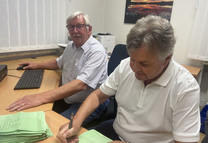 Kißlegg – Sonntag von 14.00 bis 22.00 Uhr und Montag (10.6.) von 8.00 bis 14.00 Uhr. Die beiden Kisslegger Gemeinderäte Werner Schuwerk (links) und Wolfgang Schuwerk zählten Briefwahl-Stimmen aus. In ihrer Gruppe 500 Wahlunterlagen. Also ordentlich Arbeit. „Um zehn gab’s einen Leberkäs“, berichtet Wolfgang Schuwerk vom Montagvormittag. Freilich nicht die einzige Erinnerung des Wahlhelfers an seinen Einsatz für Demokratie.