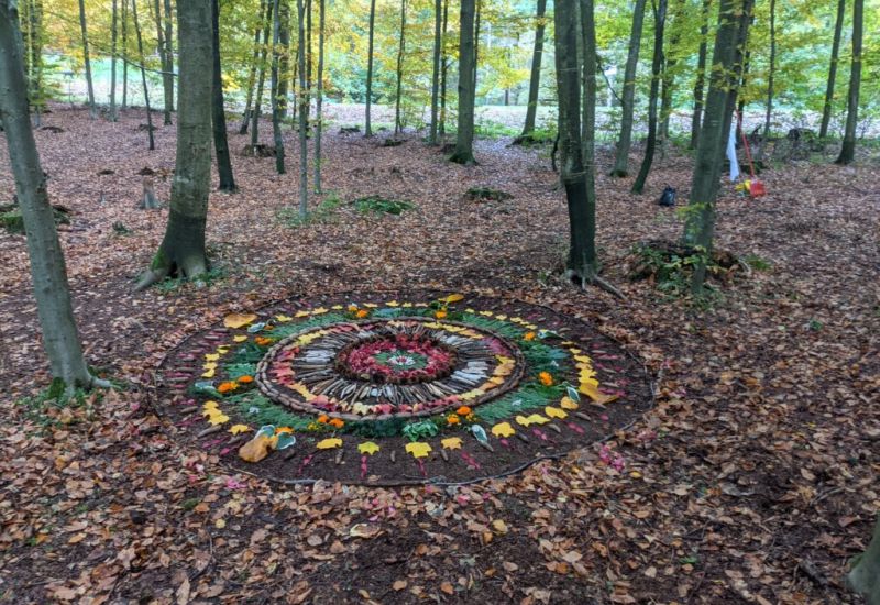 Bad Waldsee / Leutkirch – Die regionale Friedensgebetsgruppe hat sich am Feiertag Allerheiligen in Bad Waldsee getroffen. Im schönen lichten Tannenbühl wurde dazu ein Jahreskreis-Mandala aus natürlichen Materialen gelegt. Dabei spielten auch die Farben und alle Elemente eine Rolle.