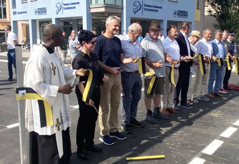 Leutkirch – Viel Sonnenlicht leuchtete und viel politische Prominenz aus Leutkirch und drüber raus strahlte. Am Freitagvormittag kurz vor 11.00 Uhr schnappten etliche Scheren zu, um das symbolische Sperrband auf der Mohrenbrücke zu zerschneiden. Weihwassertropfen des kirchlichen Segens kurz davor hatten so manch wichtigem Besuch etwas Kühlung vor der sengenden Hitze verschafft.