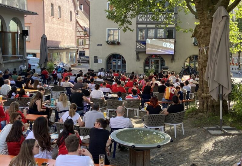 Leutkirch (rei) – Fußball in Gemeinschaft schauen – für viele Fans gibt es nichts Schöneres. Fachsimpeln und Biertrinken – das passt. Auf dem Platz am Kornhaus hat man regelmäßig Gelegenheit dazu. So auch heute beim Deutschland-Spiel. Um 18.00 ist Anpfiff. Früher kommen empfiehlt sich – um einen Platz zu ergattern und auch wegen es Warmups, wie passionierte Rudelgucker zu sagen pflegen. Auf Deutsch könnte man „Sich einstimmen“ dazu sagen. Aber es ist wohl nicht ganz genau dasselbe. Unser Report…