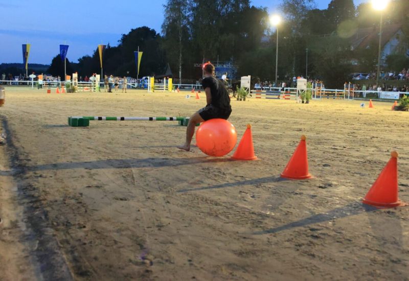 Hauerz – Nicht nur Pferde haben die Hufe geschwungen am Showabend in Hauerz auf dem Reitgelände. Zweibeiner sind genauso gefordert werden. Es galt nämlich zu hüpfen, gegen ein Bungee-Seil anzurennen und Tennisbälle sammeln und, man beachte, unter einer Hindernisstange durchzuspringen. Darunter war der Wassergraben, der sonst eine Erschwernis für Springpferde ist. Nachstehend Eindrücke unseres Reporters Hans Reichert, der viele Bilder „geschossen“ hat (siehe Galerie). Ergebnisse vom Samstagaben…